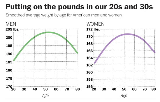 On average, people gain 1 to 3 pounds per year from their twenties into their forties. Just look at this graph from the CDC.